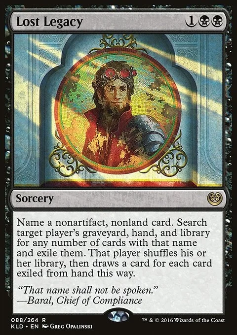Choose a nonartifact, nonland card name. Search target player's graveyard, hand, and library for any number of cards with that name and exile them. That player shuffles, then draws a card for each card exiled from their hand this way.