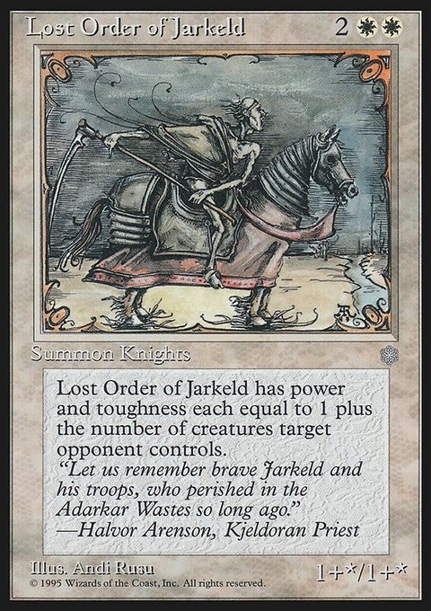 Lost Order of Jarkeld has power and toughness each equal to 1 plus the number of creatures target opponent controls.
