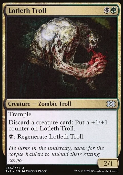 Trample Discard a creature card: Put a +1/+1 counter on Lotleth Troll. {B}: Regenerate Lotleth Troll.