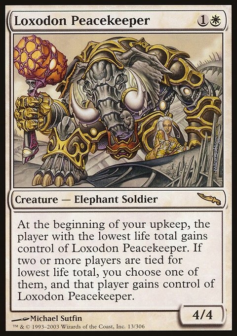 At the beginning of your upkeep, the player with the lowest life total gains control of Loxodon Peacekeeper. If two or more players are tied for lowest life total, you choose one of them, and that player gains control of Loxodon Peacekeeper.