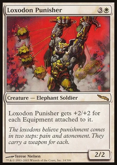 Loxodon Punisher gets +2/+2 for each Equipment attached to it.