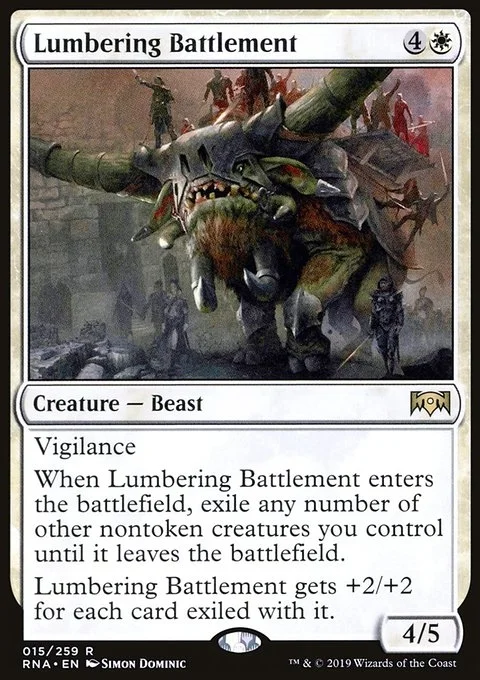 Vigilance When Lumbering Battlement enters the battlefield, exile any number of other nontoken creatures you control until it leaves the battlefield. Lumbering Battlement gets +2/+2 for each card exiled with it.