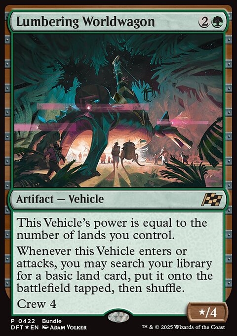This Vehicle's power is equal to the number of lands you control. Whenever this Vehicle enters or attacks, you may search your library for a basic land card, put it onto the battlefield tapped, then shuffle. Crew 4