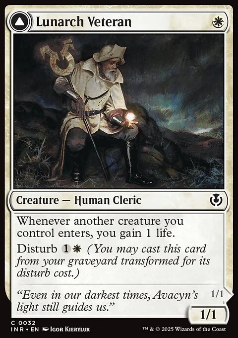 Lunarch Veteran Whenever another creature you control enters, you gain 1 life. Disturb {1}{W} (You may cast this card from your graveyard transformed for its disturb cost.) Luminous Phantom Flying Whenever another creature you control leaves the battlefield, you gain 1 life. If Luminous Phantom would be put into a graveyard from anywhere, exile it instead.