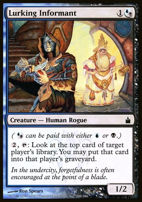 ({U/B} can be paid with either {U} or {B}.) {2}, {T}: Look at the top card of target player's library. You may put that card into that player's graveyard.