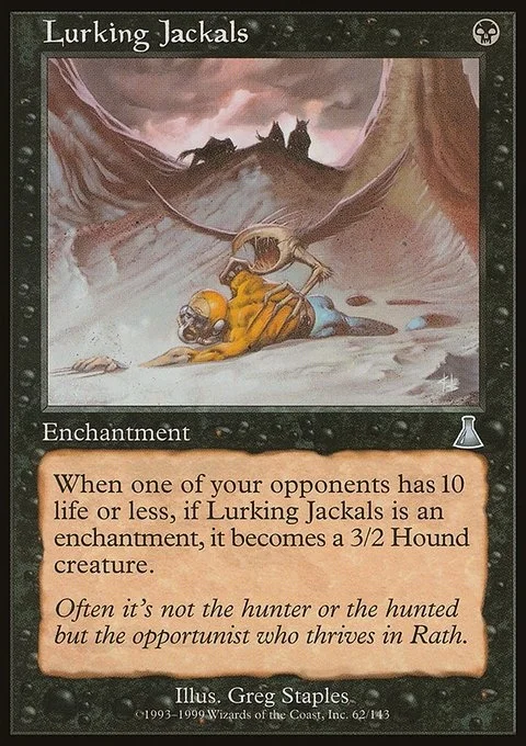 When one of your opponents has 10 life or less, if Lurking Jackals is an enchantment, it becomes a 3/2 Hound creature.