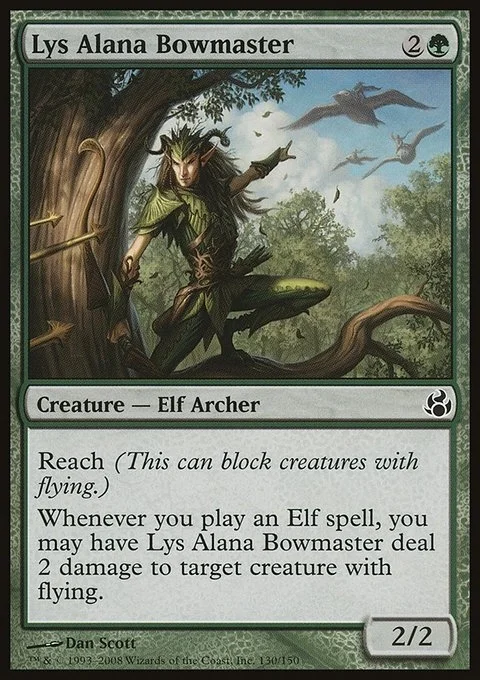 Reach Whenever you cast an Elf spell, you may have Lys Alana Bowmaster deal 2 damage to target creature with flying.