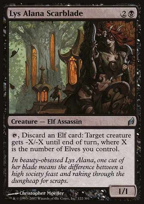 {T}, Discard an Elf card: Target creature gets -X/-X until end of turn, where X is the number of Elves you control.