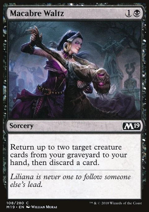 Return up to two target creature cards from your graveyard to your hand, then discard a card.