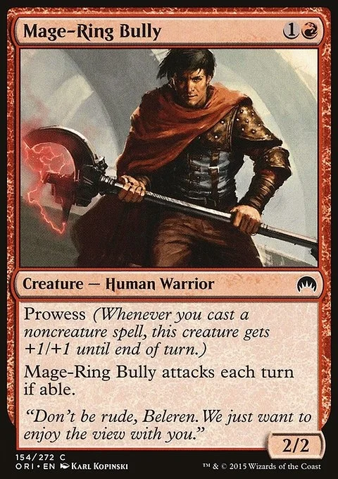 Prowess (Whenever you cast a noncreature spell, this creature gets +1/+1 until end of turn.) Mage-Ring Bully attacks each combat if able.