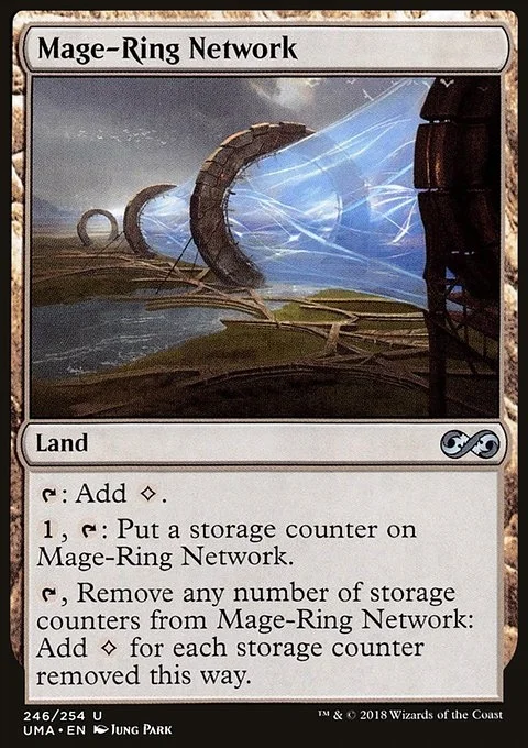 {T}: Add {C}. {1}, {T}: Put a storage counter on Mage-Ring Network. {T}, Remove any number of storage counters from Mage-Ring Network: Add {C} for each storage counter removed this way.