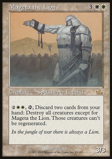 {2}{W}{W}, {T}, Discard two cards: Destroy all creatures except for Mageta the Lion. Those creatures can't be regenerated.