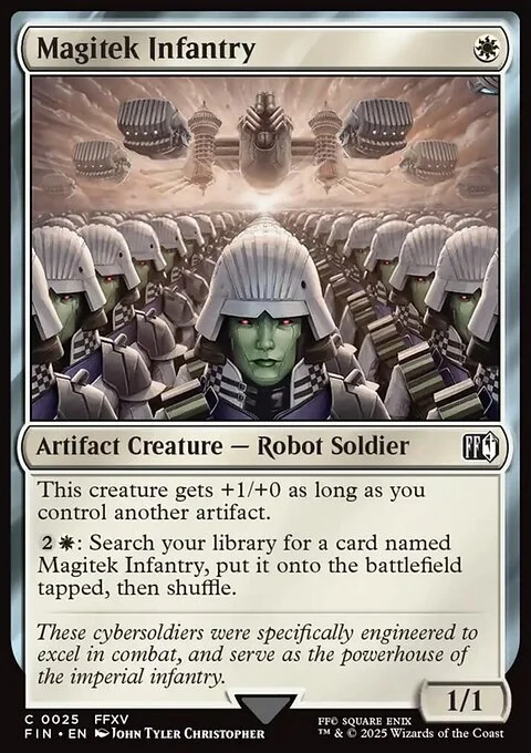 This creature gets +1/+0 as long as you control another artifact. {2}{W}: Search your library for a card named Magitek Infantry, put it onto the battlefield tapped, then shuffle.