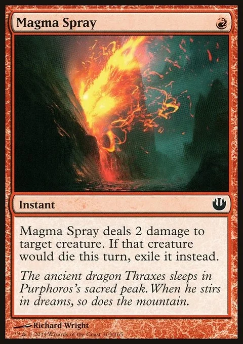 Magma Spray deals 2 damage to target creature. If that creature would die this turn, exile it instead.