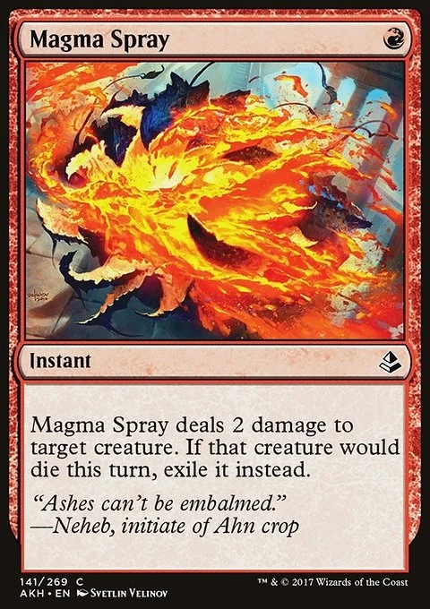 Magma Spray deals 2 damage to target creature. If that creature would die this turn, exile it instead.