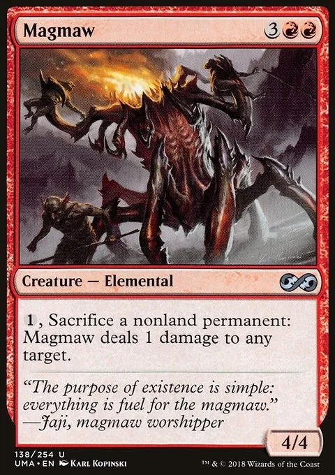 {1}, Sacrifice a nonland permanent: Magmaw deals 1 damage to any target.