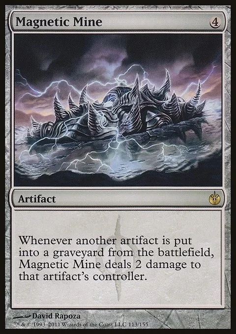Whenever another artifact is put into a graveyard from the battlefield, Magnetic Mine deals 2 damage to that artifact's controller.