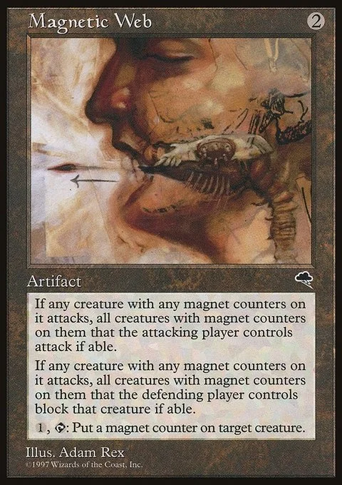 If any creature with any magnet counters on it attacks, all creatures with magnet counters on them that the attacking player controls attack if able.If any creature with any magnet counters on it attacks, all creatures with magnet counters on them that the defending player controls block that creature if able.1, T: Put a magnet counter on target creature.