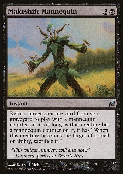 Return target creature card from your graveyard to the battlefield with a mannequin counter on it. For as long as that creature has a mannequin counter on it, it has "When this creature becomes the target of a spell or ability, sacrifice it."