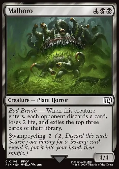 Bad Breath — When this creature enters, each opponent discards a card, loses 2 life, and exiles the top three cards of their library.