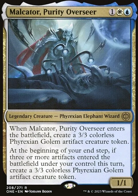 When Malcator, Purity Overseer enters the battlefield, create a 3/3 colorless Phyrexian Golem artifact creature token.