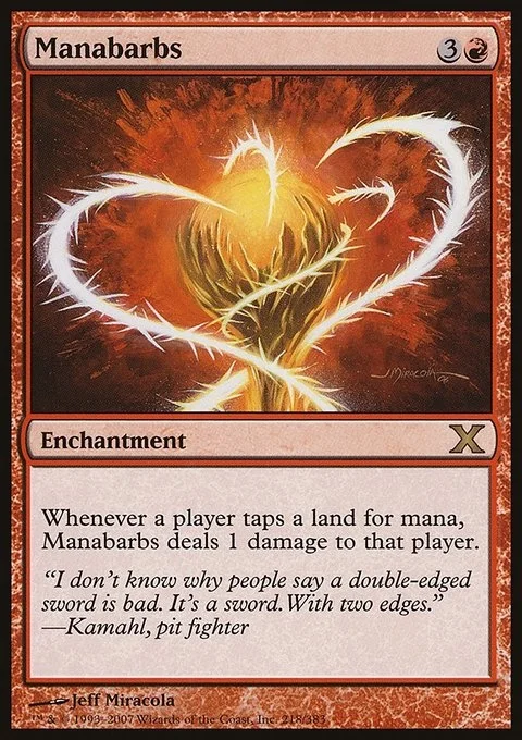 Whenever a player taps a land for mana, Manabarbs deals 1 damage to that player.