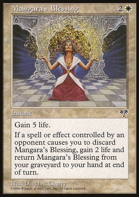 Gain 5 life.If a spell or effect controlled by an opponent causes you to discard Mangara’s Blessing, gain 2 life and return Mangara’s Blessing from your graveyard to your hand at end of turn.