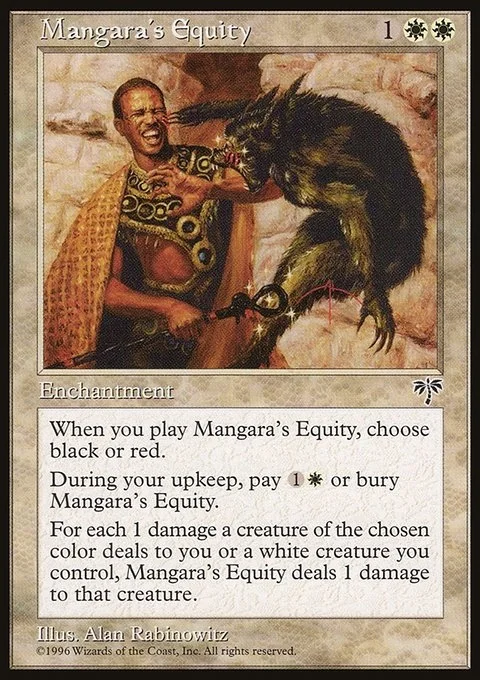 When you play Mangara’s Equity, choose black or red.During your upkeep, pay 1W or bury Mangara’s Equity.For each 1 damage a creature of the chosen color deals to you or a white creature you control, Mangara’s Equity deals 1 damage to that creature.