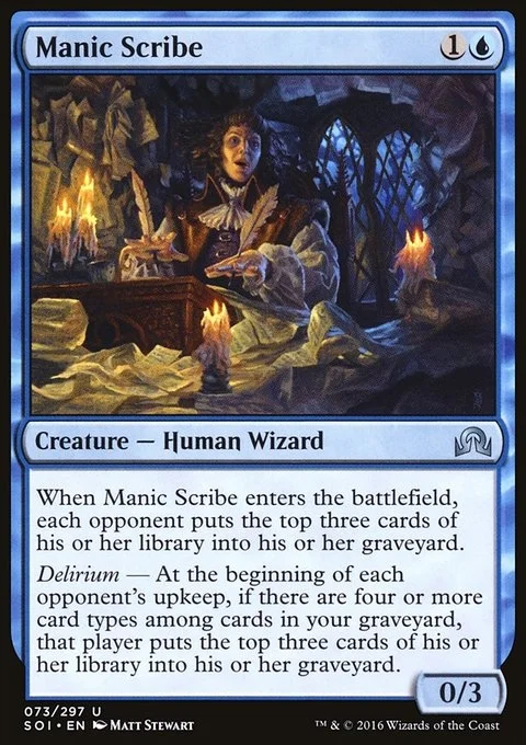 When Manic Scribe enters the battlefield, each opponent mills three cards. Delirium — At the beginning of each opponent's upkeep, if there are four or more card types among cards in your graveyard, that player mills three cards.
