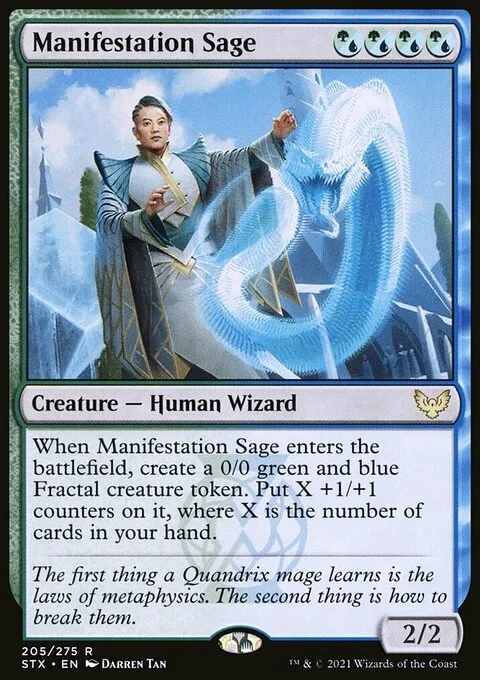 When Manifestation Sage enters the battlefield, create a 0/0 green and blue Fractal creature token. Put X +1/+1 counters on it, where X is the number of cards in your hand.