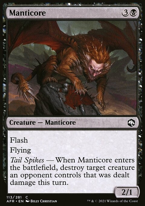 Flash Flying Tail Spikes — When Manticore enters the battlefield, destroy target creature an opponent controls that was dealt damage this turn.