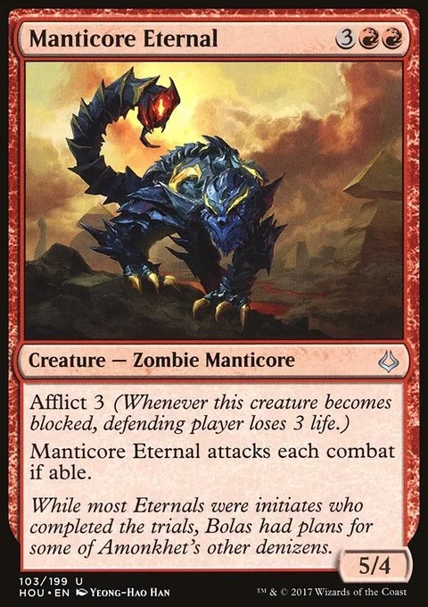 Afflict 3 (Whenever this creature becomes blocked, defending player loses 3 life.) Manticore Eternal attacks each combat if able.