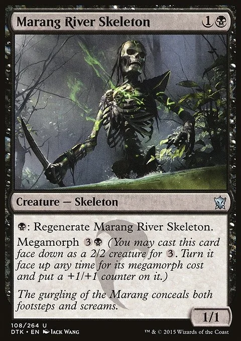 {B}: Regenerate Marang River Skeleton. Megamorph {3}{B} (You may cast this card face down as a 2/2 creature for {3}. Turn it face up any time for its megamorph cost and put a +1/+1 counter on it.)