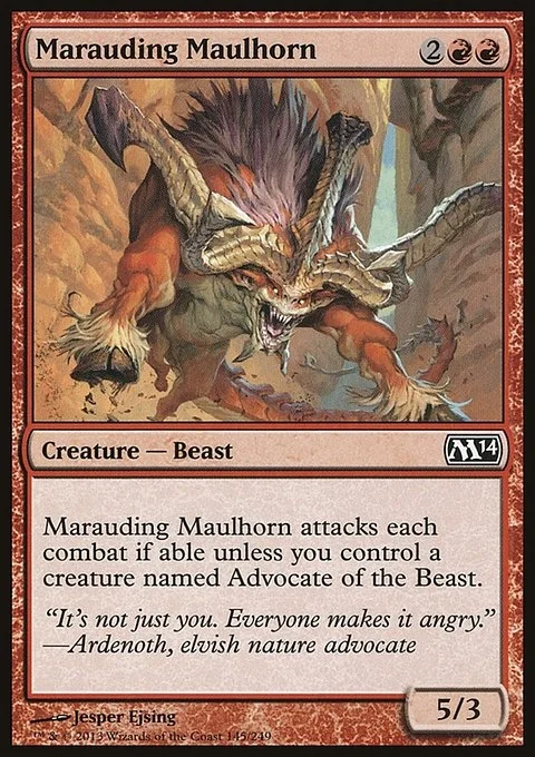 Marauding Maulhorn attacks each combat if able unless you control a creature named Advocate of the Beast.