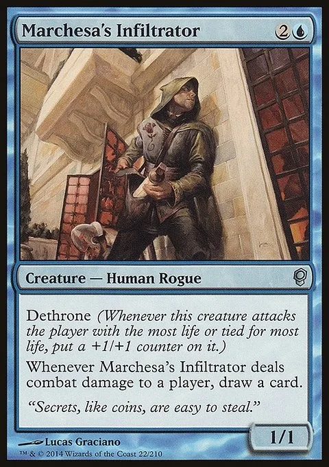 Dethrone (Whenever this creature attacks the player with the most life or tied for most life, put a +1/+1 counter on it.) Whenever Marchesa's Infiltrator deals combat damage to a player, draw a card.