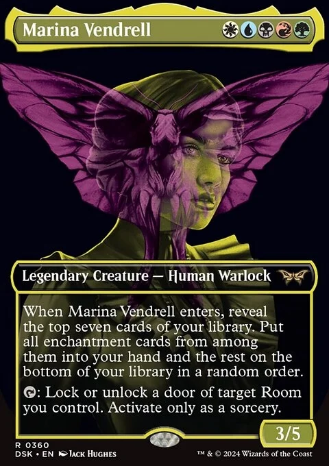When Marina Vendrell enters, reveal the top seven cards of your library. Put all enchantment cards from among them into your hand and the rest on the bottom of your library in a random order. {T}: Lock or unlock a door of target Room you control. Activate only as a sorcery.