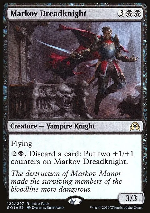 Flying {2}{B}, Discard a card: Put two +1/+1 counters on Markov Dreadknight.