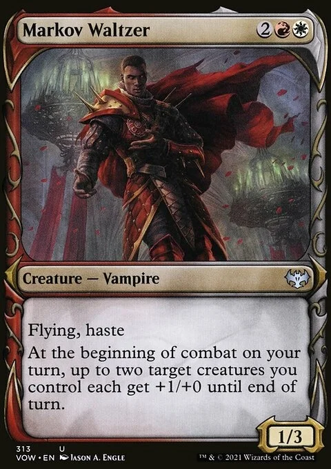 Flying, haste At the beginning of combat on your turn, up to two target creatures you control each get +1/+0 until end of turn.