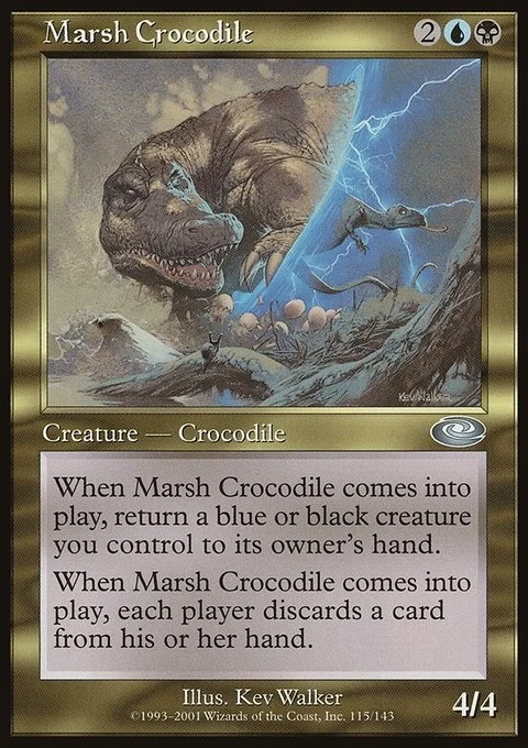 When Marsh Crocodile enters the battlefield, return a blue or black creature you control to its owner's hand. When Marsh Crocodile enters the battlefield, each player discards a card.
