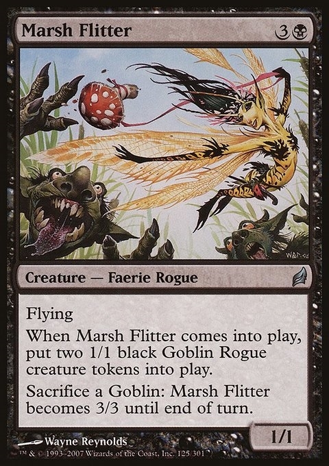 Flying When this creature enters, create two 1/1 black Goblin Rogue creature tokens. Sacrifice a Goblin: This creature has base power and toughness 3/3 until end of turn.