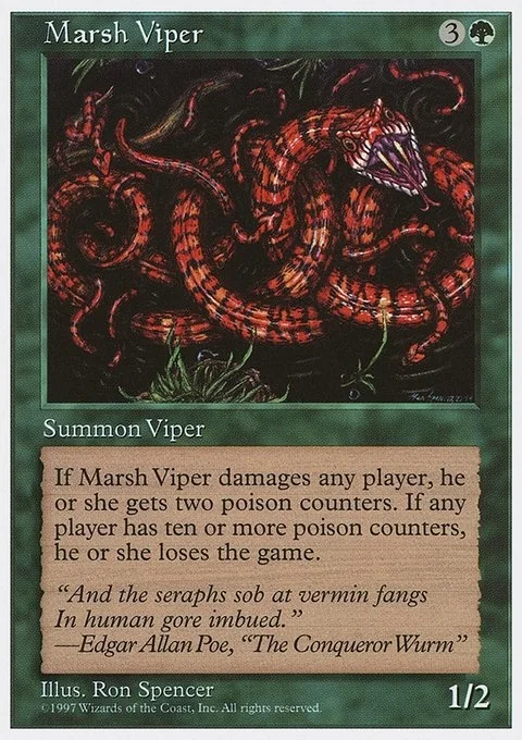 Whenever Marsh Viper deals damage to a player, that player gets two poison counters. (A player with ten or more poison counters loses the game.)