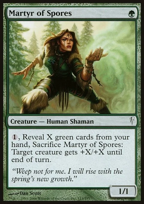 {1}, Reveal X green cards from your hand, Sacrifice Martyr of Spores: Target creature gets +X/+X until end of turn.