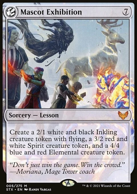 Create a 2/1 white and black Inkling creature token with flying, a 3/2 red and white Spirit creature token, and a 4/4 blue and red Elemental creature token.