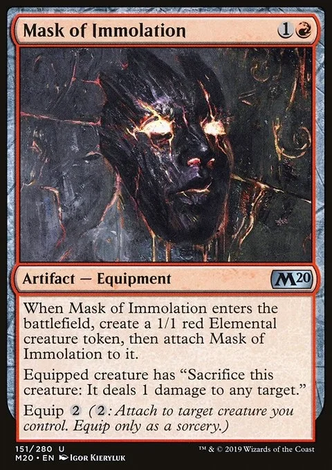 When Mask of Immolation enters the battlefield, create a 1/1 red Elemental creature token, then attach Mask of Immolation to it.