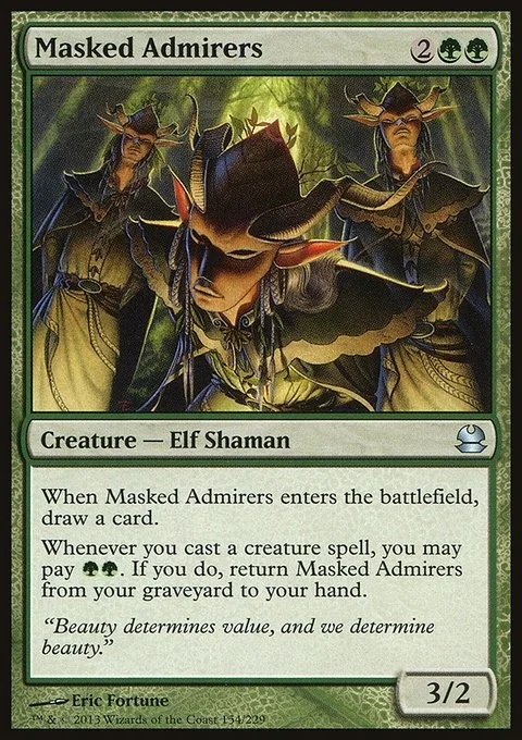 When Masked Admirers enters the battlefield, draw a card. Whenever you cast a creature spell, you may pay {G}{G}. If you do, return Masked Admirers from your graveyard to your hand.