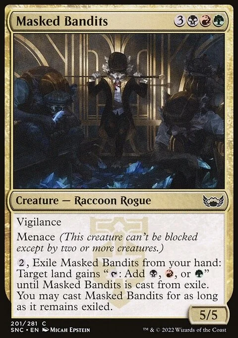 Vigilance Menace (This creature can't be blocked except by two or more creatures.) {2}, Exile this card from your hand: Target land gains "{T}: Add {B}, {R}, or {G}" until this card is cast from exile. You may cast this card for as long as it remains exiled.