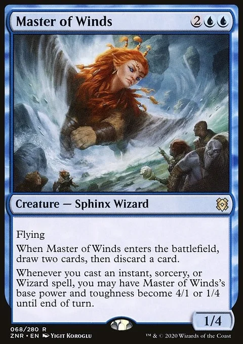 Flying When Master of Winds enters the battlefield, draw two cards, then discard a card. Whenever you cast an instant, sorcery, or Wizard spell, you may have Master of Winds's base power and toughness become 4/1 or 1/4 until end of turn.