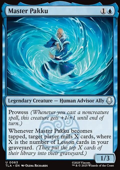 Whenever Master Pakku becomes tapped, target player mills X cards, where X is the number of Lesson cards in your graveyard. (They put the top X cards of their library into their graveyard.)