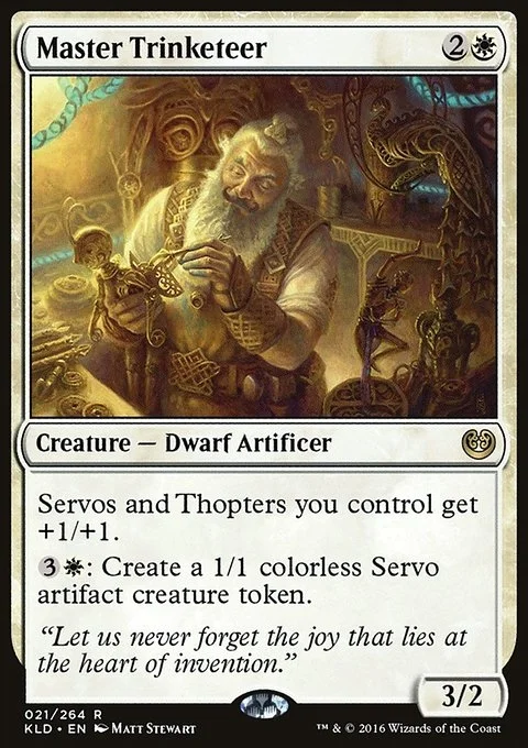 Servos and Thopters you control get +1/+1. {3}{W}: Create a 1/1 colorless Servo artifact creature token.