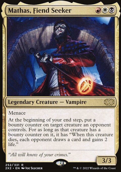 Menace At the beginning of your end step, put a bounty counter on target creature an opponent controls. For as long as that creature has a bounty counter on it, it has "When this creature dies, each opponent draws a card and gains 2 life."